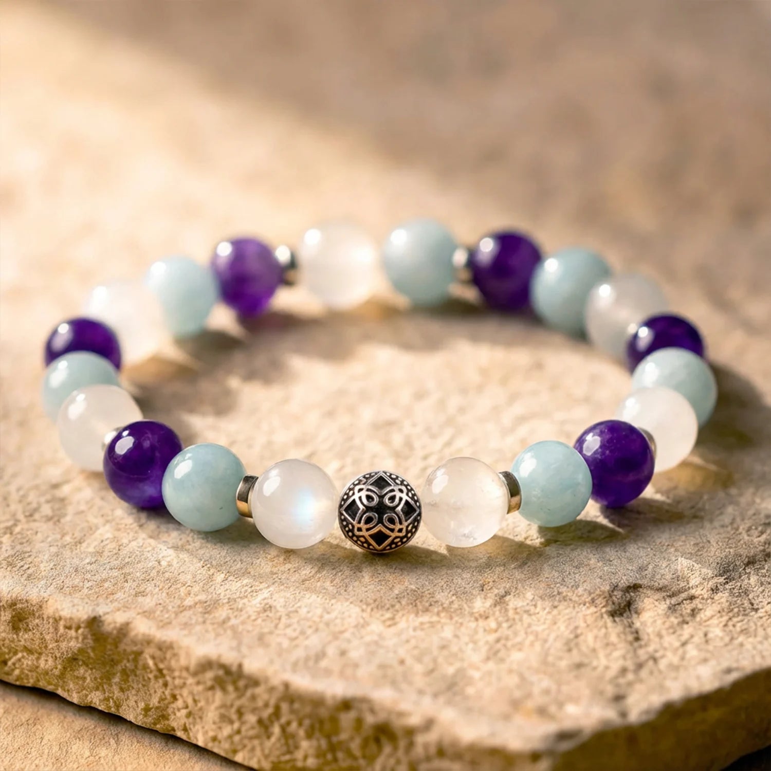 Matériaux : Aigue Marine, Pierre de Lune, Améthyste (qualité AAA), Acier inoxydable