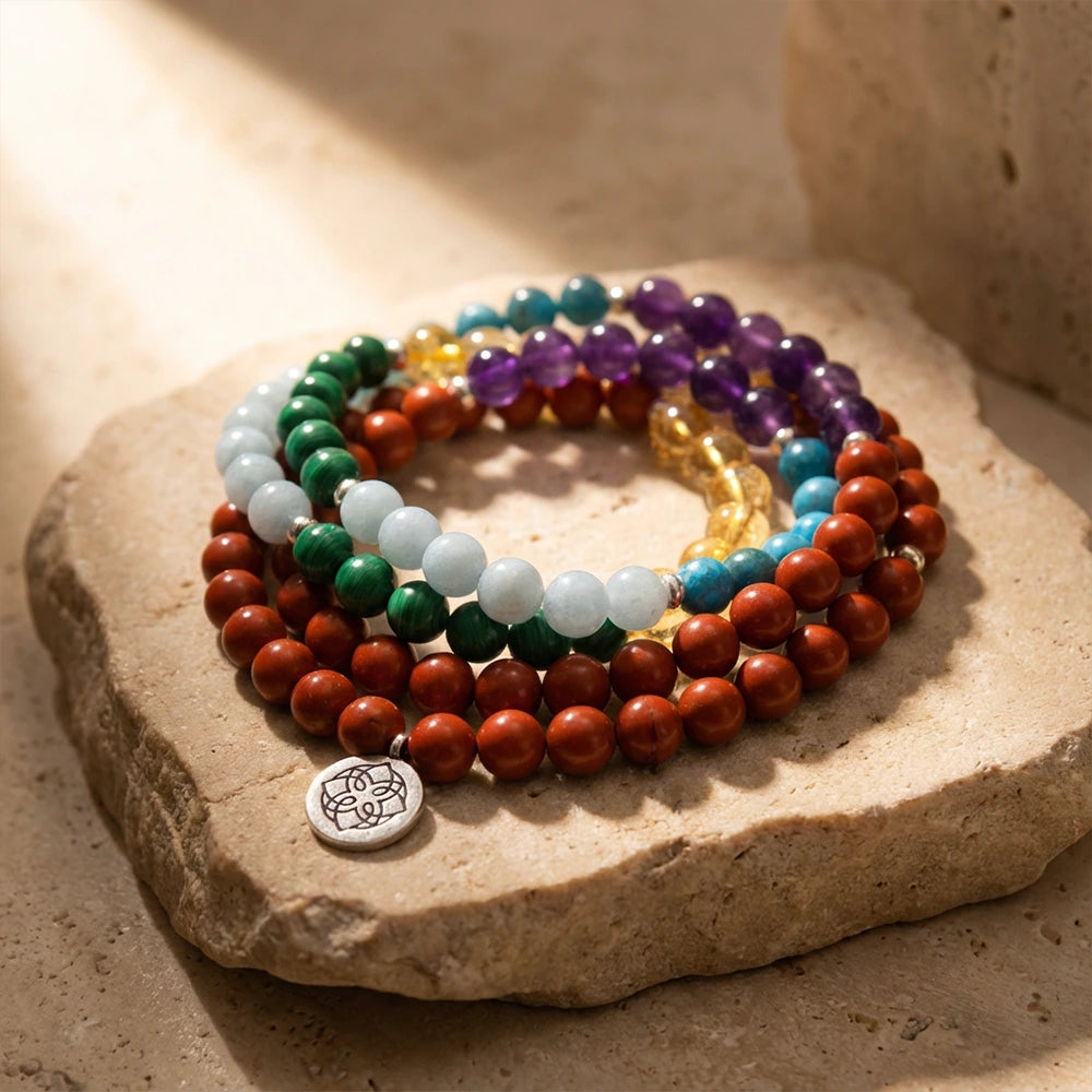 Confectionné à la main, ce Mâlâ 7 Chakras en pierres naturelles arbore 7 pierres subtilement sélectionnées dans le but de rééquilibrer vos 7 Chakras.