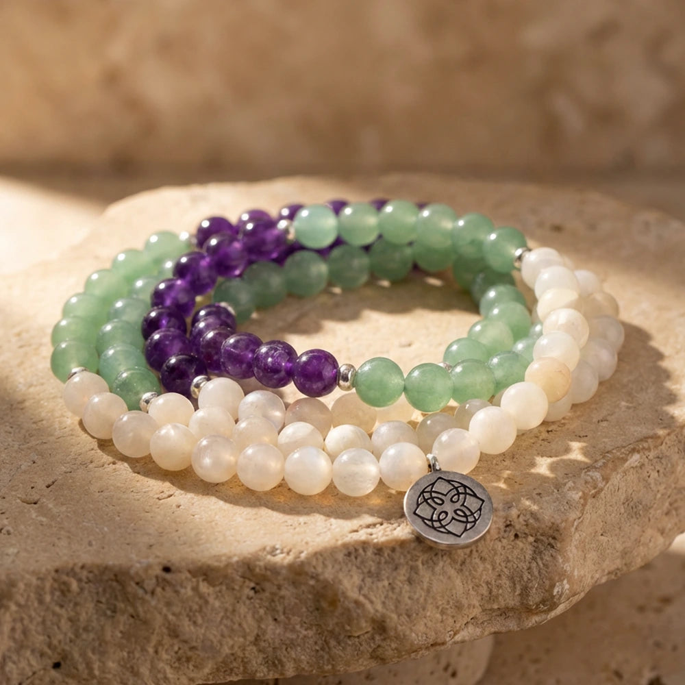 Matériaux : Améthyste, Pierre de Lune, Aventurine (qualité AAA)