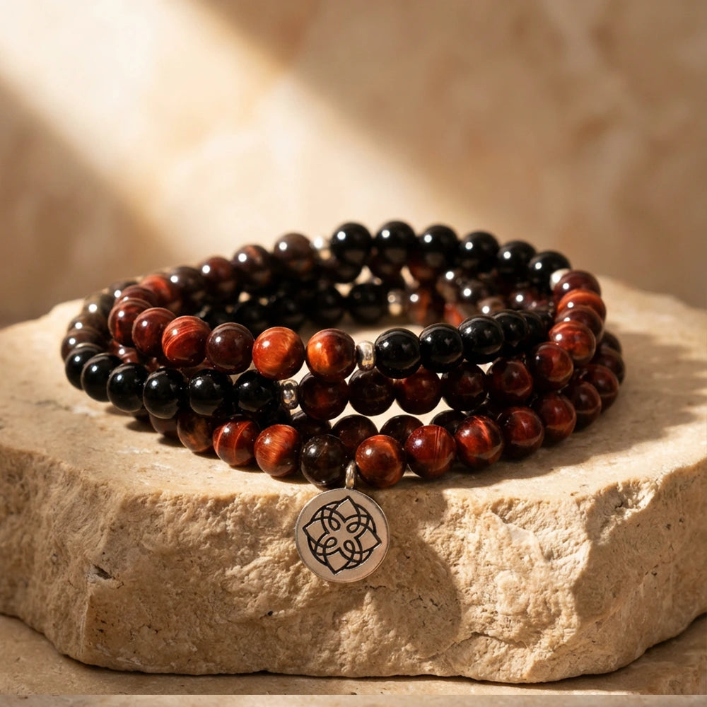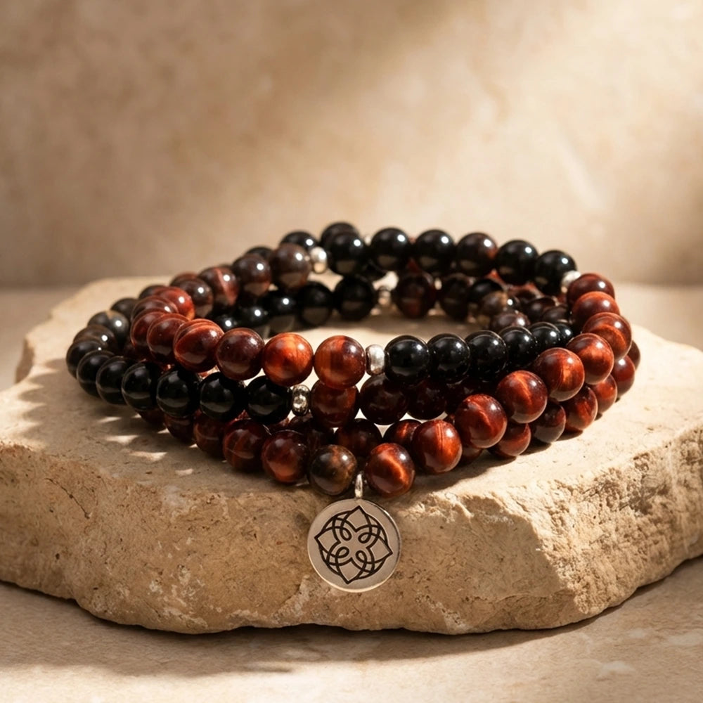 Le Mâlâ Feu Intérieur, composé d’Œil de Tigre Rouge, d’Onyx et de Grenat, vous aidera à trouver en vous la force (qu'elle soit physique ou mentale) dont vous aurez besoin pour répondre aux nombreux challenges du quotidien.