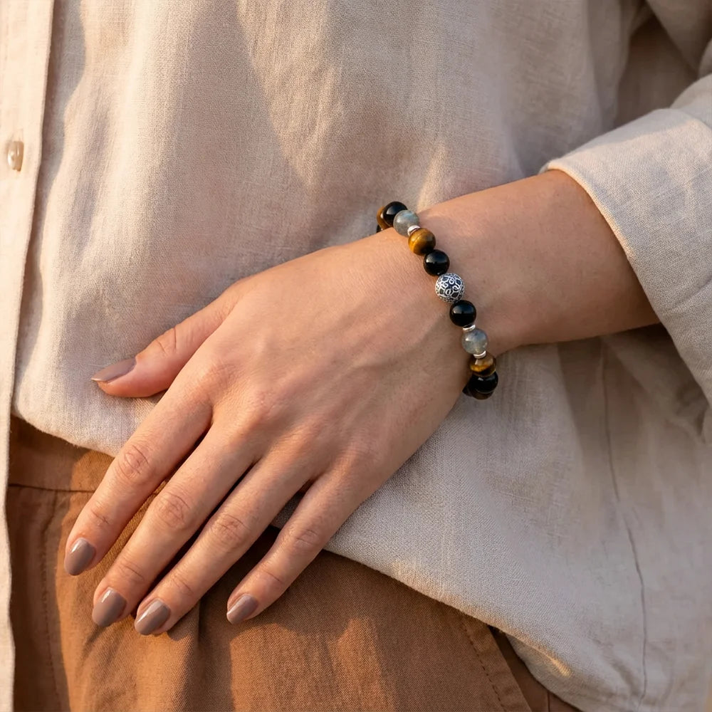 Matériaux : Oeil de Tigre, Labradorite, Obsidienne, Acier Inoxydable