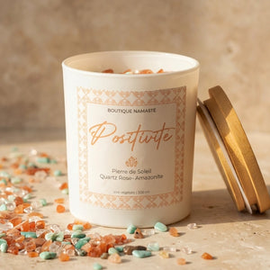La bougie Positivité est entièrement conçue à la main et se compose de pierres soigneusement sélectionnées afin de vous permettre de retrouver optimisme, bonheur et paix.