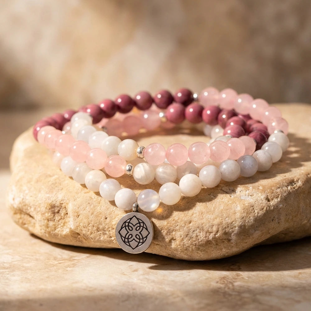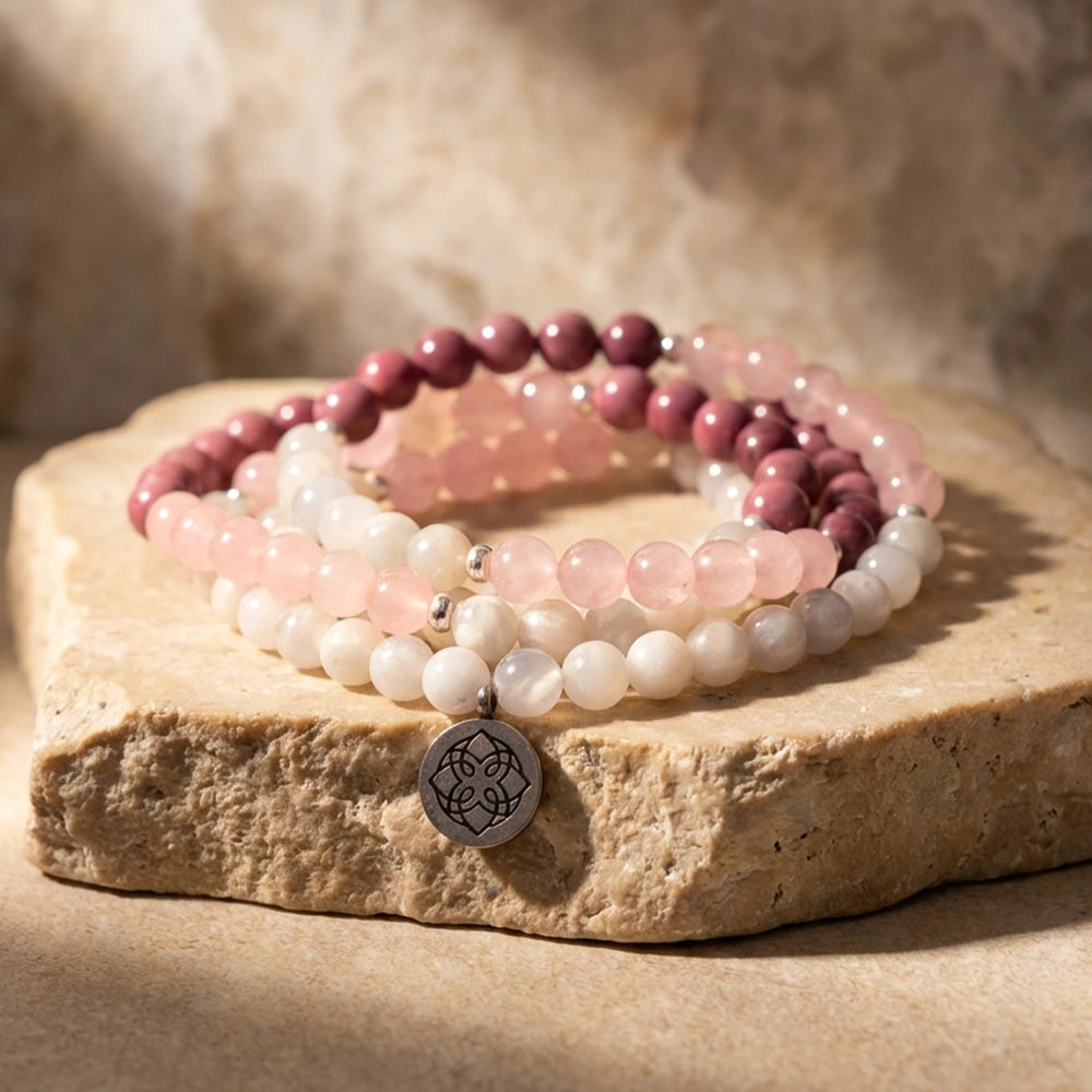 Matériaux : Quartz Rose, Pierre de Lune, Rhodochrosite (qualité AAA), Acier Inoxydable