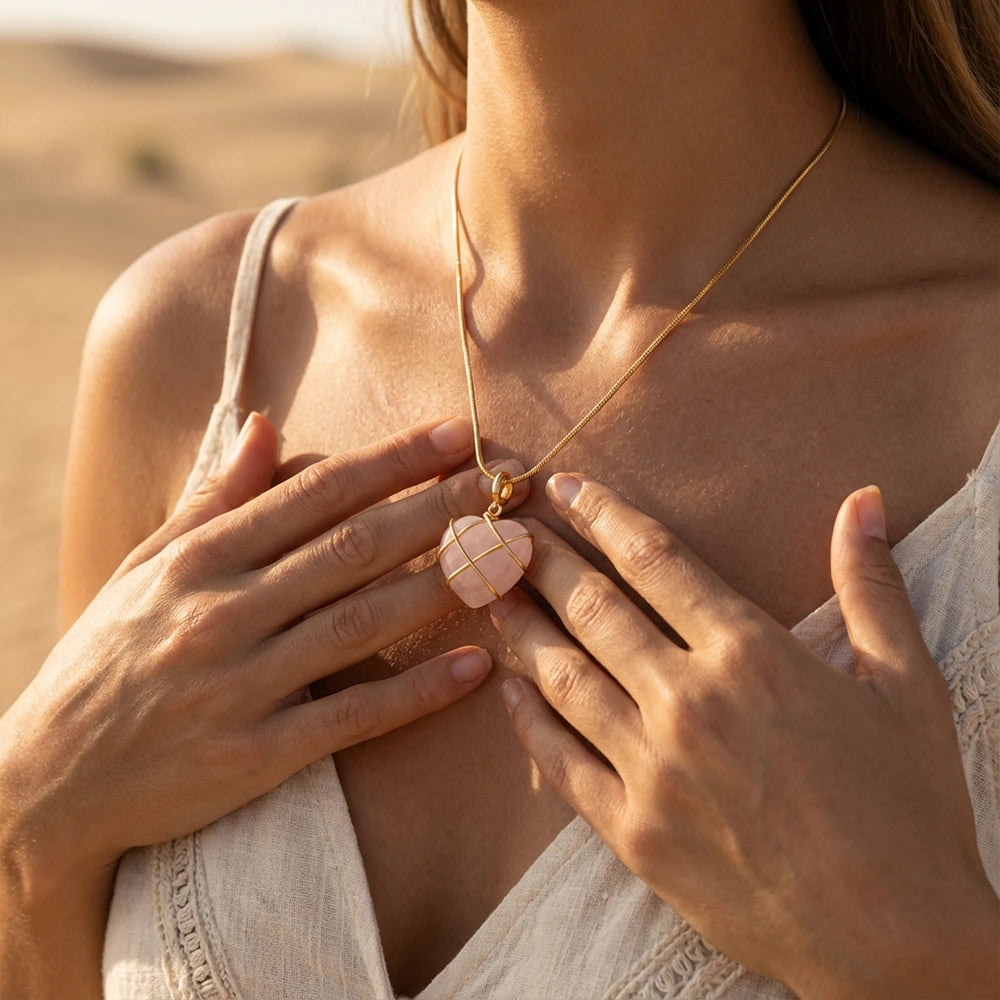 Le design en forme de cœur, délicatement entouré de fils d'acier inoxydable doré, symbolise l'amour et la protection. Ce pendentif est non seulement un magnifique accessoire de mode, mais aussi un talisman puissant pour attirer l'amour et la paix intérieure.