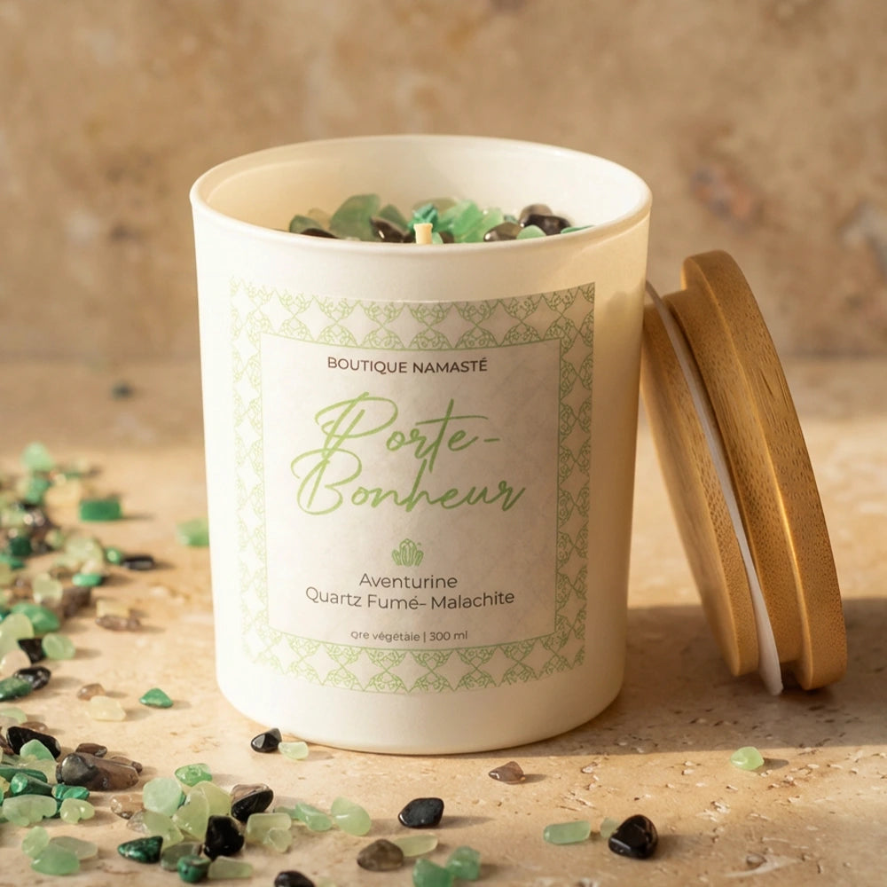 La Bougie Porte-Bonheur est entièrement conçue à la main et se compose de pierres soigneusement sélectionnées afin de vous permettre de canaliser les énergies positives, attirer la chance dans votre vie quotidienne, et vous offrir une protection contre les influences négatives.