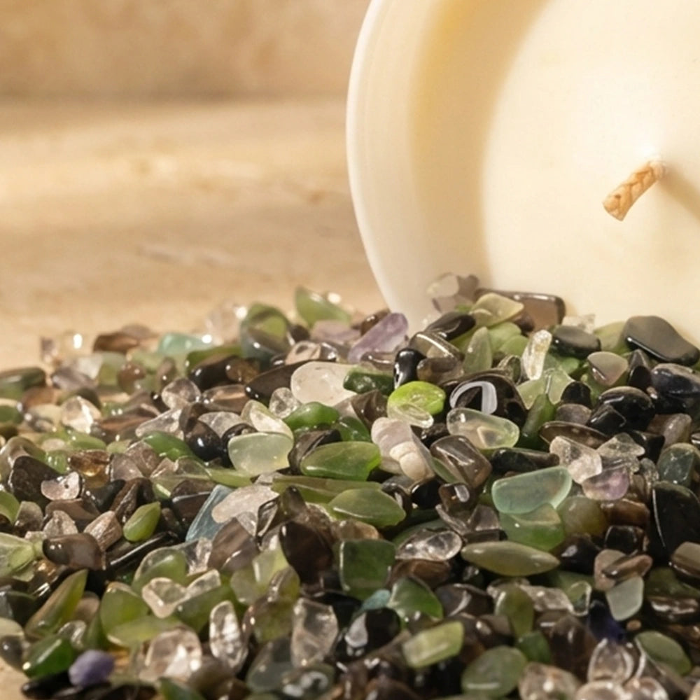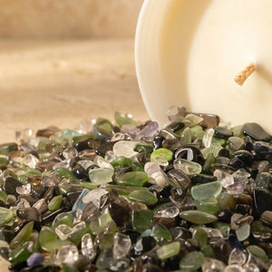 Sa mèche en coton garantit une combustion douce et homogène, tandis que les pierres qu'elle contient vous accompagneront bien après que la flamme se soit éteinte.